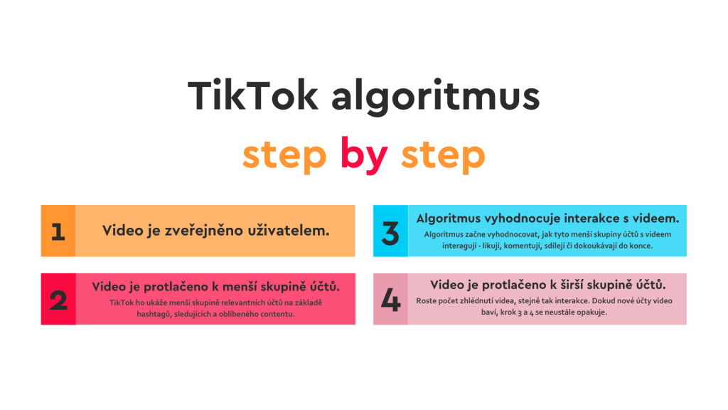 Algoritmus TikToku je důvodem jeho úspěchu. Umí se perfektně přizpůsobovat aktuálním zájmům, umí vyhodnocovat pozornost uživatele i témata, která s ním rezonují. A právě díky tomu dokáže vaše video ukázat těm nejsprávnějším uživatelům. Pokud vyhodnotí, že tuto cílovou skupinu video baví, pak už algoritmus jen rozšiřuje okruh lidí, kterým video ukáže.