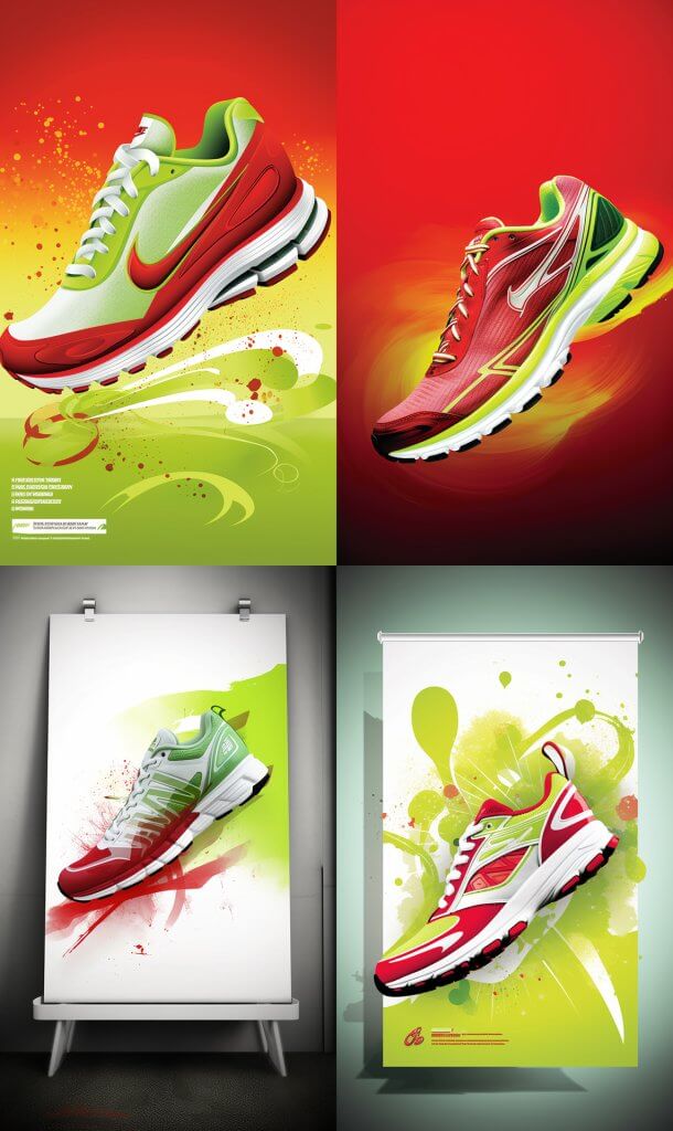V poslední částí jsem ustoupil od tvorby fotografií a zaměřil jsem se na grafický design. Zde bohužel nejsem výsledkem nijak uchvácen. Zadal jsem AI, aby mi vytvořila grafické elementy nebo reklamní banner na určité zboží. Jediné v čem jsem ji malinko svázal ruce bylo omezení barev, formátu a že má design být současný. Říkal jsem si, že by Midjourney mohl dobře fungovat jako nástroj pro rozšíření moodboardů nebo jako dodatečný zdroj inspirace. Bohužel, opak je pravdou. Výsledky jsou synonymem slova „prvoplánové“. Malinko jsem zde doufal, že uvidíme neotřelé, svým způsobem i divně pokroucené výjevy, které by normálního člověka nenapadly.