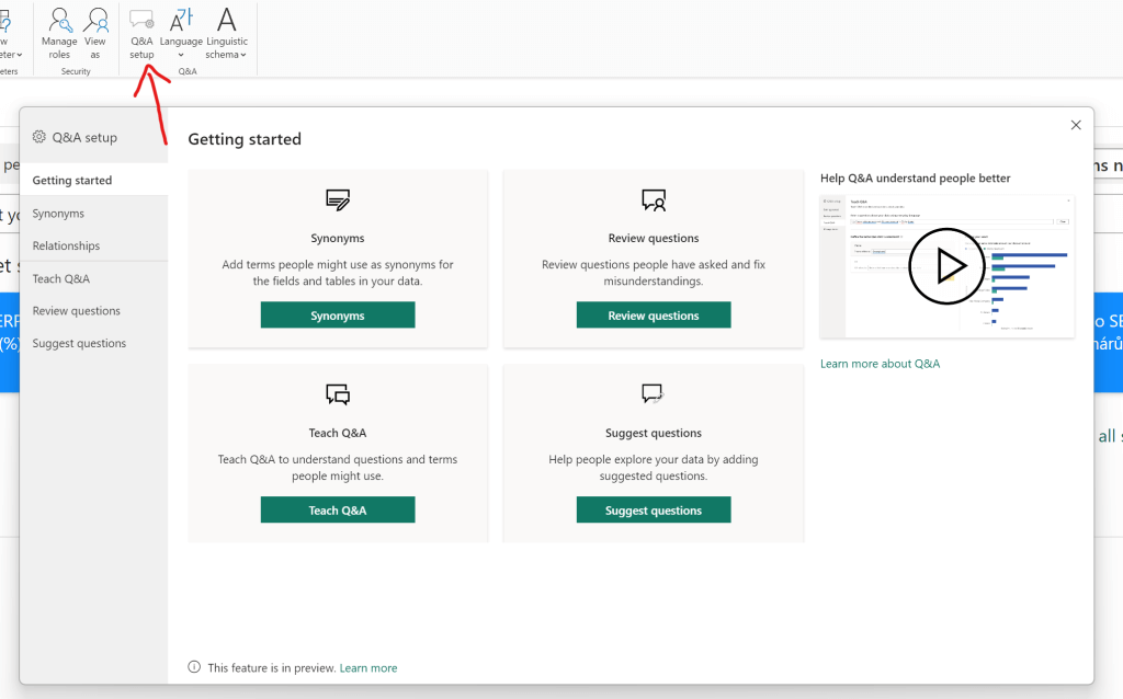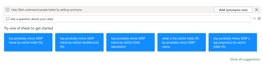 Zde můžete například nastavit synonyma, díky kterým model lépe rozpozná, která slova se vztahují ke které metrice nebo sloupci. Nebo můžete také prozkoumat otázky, na které se uživatelé ptali, a zkontrolovat, jakou dostali odpověď. V případě, že odpověď byla chybná, můžete Power BI navést, jak by měla správná odpověď vypadat. Mimo to můžete také nastavit „doporučené“ otázky.