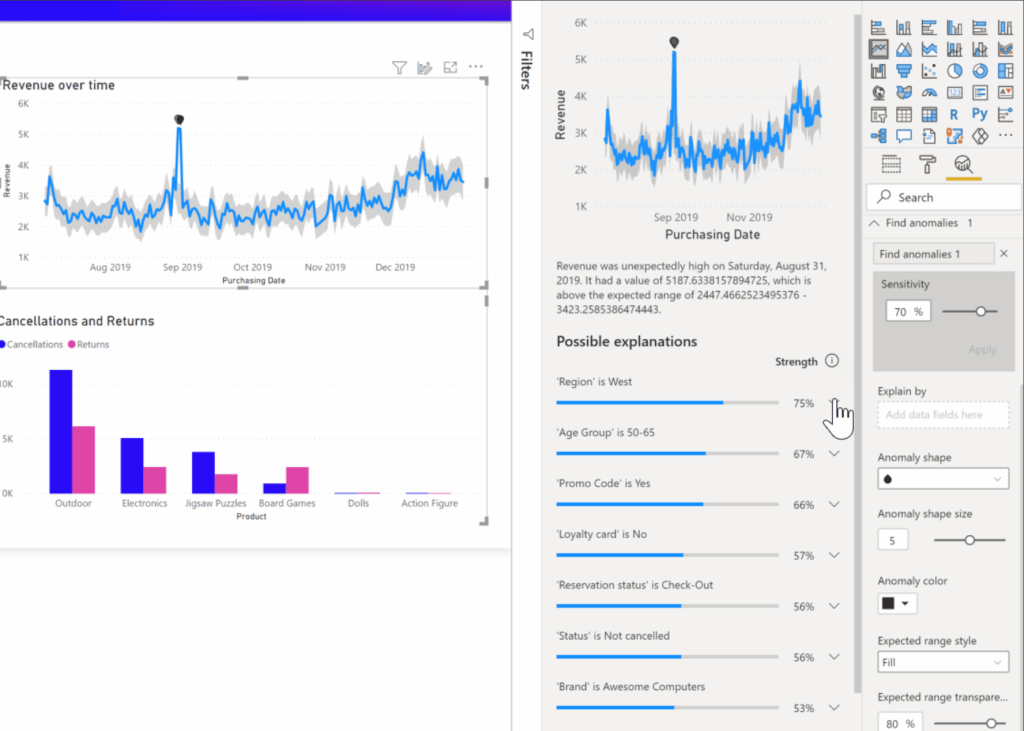 Mezi další schopnosti Power BI patří predikce. Můžete je využít především pro grafy, které zobrazují vývoj metriky v čase (třeba tržeb, prodaných kusů atd.). S takovými predikcemi vám dobře poradí článek How to Forecast Data in Power BI.
