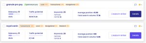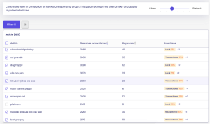 Užitečná funkce, která vám na základě klíčových slov (max. 5) a seznamu konkurence (max. 20) poskládá „nákupní seznam“ klíčových slov pro naplánování článku. Tj. vyhodnotí, který obsah je očekáván v kontextu nějakého klíčového slova. Může to znamenat buď textový obsah, produkty, které patří nahoru, či seznam kategorií, které by se vyplatilo na stránku „šoupnout“, pokud na ní dosud nejsou.