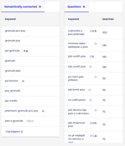 Obsahuje clustery klíčových slov pro každý topic a uživatelský záměr (můžeme si pak vyfiltrovat jen informační dotazy, nebo odfiltrovat lokální SEO). Cluster obsahuje hlavně synonyma klíčového slova. U značky to jsou nejčastěji hledané verze brandu s jeho nejznámějšími produkty.