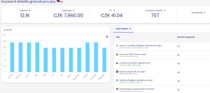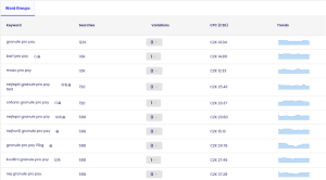 Návrhy na doplňující klíčové fráze připomínají pohled z Ahref, v kterém jsou zajímavé sémanticky propojené dotazy k našemu klíčovému slovu. Díky návrhům dalších klíčových slov a skupin slov si můžeme si vyhledat navrhované fráze ze všech možných stran.