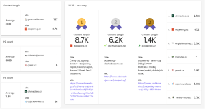 Zobrazí vám přehlednou statistiku konkurence na dané klíčové slovo. Jedná se o report s podrobnými statistikami TOP 10 výsledků a takovými detaily, jako je délka obsahu, počty nadpisů a meta titles.