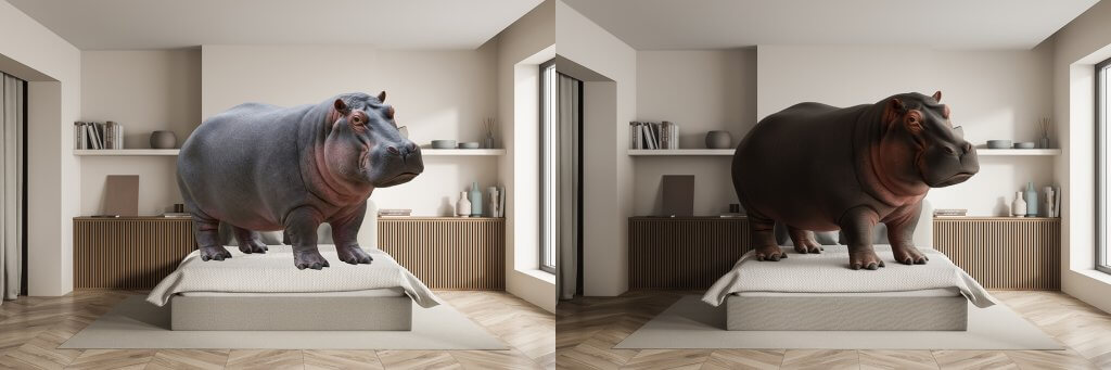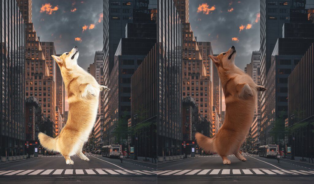 Na výsledném obrázku vidíme, že se změnila nejen barevnost medvěda, ale zlepšila se i maska, objevilo se nám nasvětlení ze strany a přidaly se i vržené stíny na zemi. Zkrátka nám „chlapec“ kompletně zapadl do scény.