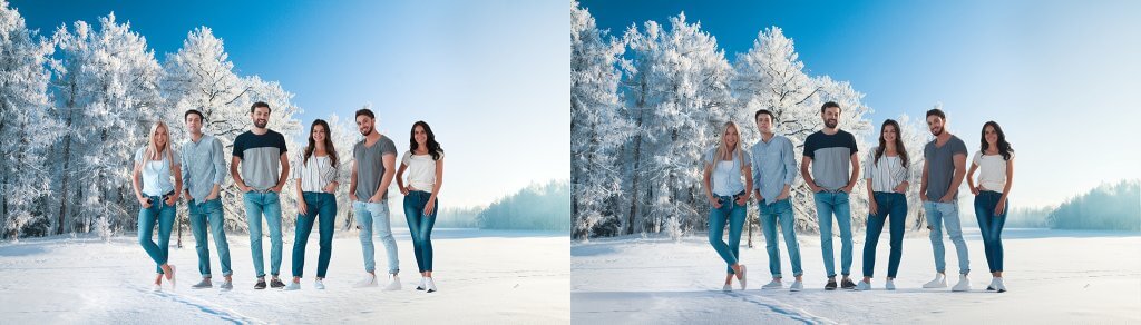 Další z důležitých úkonů, které jsem testoval, je vkládání lidí do různých prostředí. Zároveň jsem chtěl trochu otestovat limity a tak jsem volil tváře a těla, která jsou ve velmi specificky nasvíceném prostředí, aby to neměl Photoshop tak snadné. Zde jsou některé z hotových děl včetně předlohy.