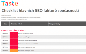 K e-booku je k dispozici i doplňující checklist v podobě tabulky, se kterým můžete krok po kroku procházet a postupně i odbavovat hlavní SEO faktory.