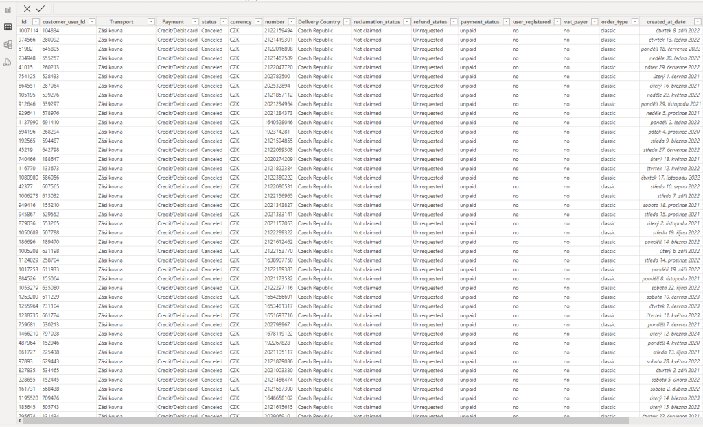 Na obrázku níže vidíte náhled celé zdrojové tabulky, ke kterému se můžete v rámci Power BI dostat na dva kliky. Bohužel podívat se tímto způsobem na původní tabulku v Looker Studiu nelze.