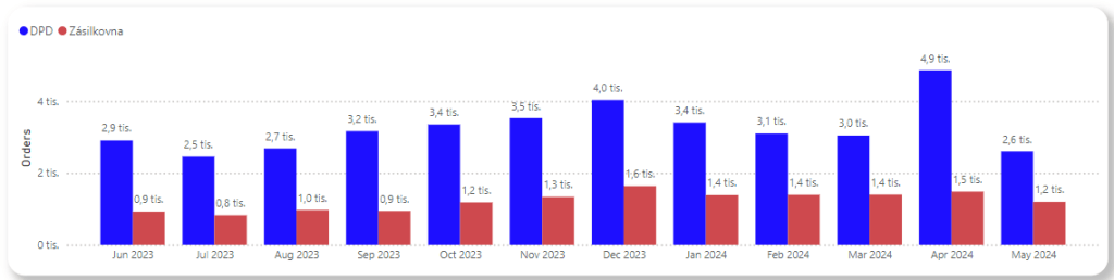 V Power BI jste schopni vytvořit sloupcový graf rozpadlý na dva či více sloupců vedle sebe. V tomto případě hovoříme o tzv. „breakdownu“. Níže můžete například vidět srovnání počtu objednávek, které využily jako způsob dopravy DPD a Zásilkovnu. Toto v Looker Studiu překvapivě nelze udělat. V Looker Studiu můžete akorát přidat sloupce takto vedle sebe, pokud se jedná o jiné metriky (například objednávky a storna).