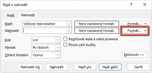 - V řádku „nahradit“ klikneme na formát.