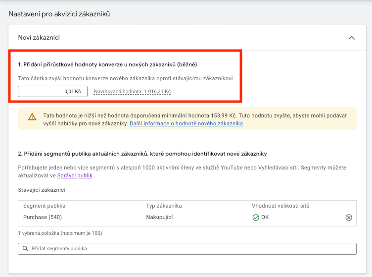 Další možností, kterou dnes máme, je nastavení akvizice zákazníků. Díky tomu můžete v Google Ads nastavit přidanou hodnotu pro nové zákazníky, a pokud si určíte vyšší hodnotu pro nové zákazníky v kampaních, tak algoritmus s tím počítá při biddingu. Osobně se mi osvědčilo přidat symbolickou hodnotu 0,01 Kč (když nemáte přesně vypočítáno, o kolik je pro vás nový zákazník hodnotnější než stávající), protože pak v segmentacích – Konverze → Noví vs. vracející se zákazníci – uvidíte, kolik zákazníků z jakého segmentu nakoupilo. U této možnosti pozor, přiřazená hodnota u zákazníků navyšuje hodnotu konverze (tržby), které od těchto zákazníků přijdou.