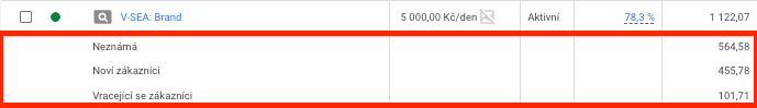 Je ale dobré vědět, že tato data nejsou úplně přesná, protože velká část konverzí často padá do kategorie „neznámá“. A také že v některých případech vám data nebudou dávat úplný smysl – třeba když u brandové kampaně vidíte poměr nových zákazníků vůči stávajícím 4:1.