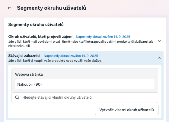 Meta Ads jsou samy o sobě specialitou – nepracují s klíčovými slovy, takže se nemůžeme řídit podle brandových a non-brandových vyhledávacích dotazů. Prvním krokem je definice segmentů okruhů uživatelů v záložce „Nastavení reklam“. Tam najdete dva segmenty – „Okruh uživatelů, kteří projevili zájem“ a „Stávající zákazníci“. Do prvního okruhu lze zařadit například návštěvníky webu, kteří nenakoupili, do druhého pak pouze uživatele, kteří provedli hlavní konverzi.