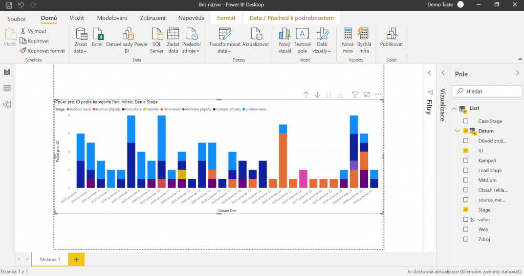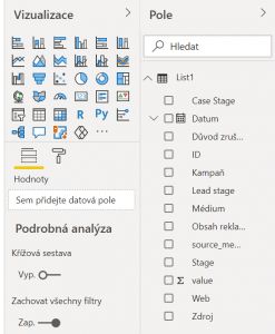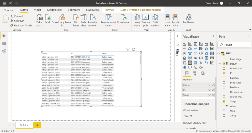 Pojďme si na závěr ještě rychle vytvořit jednoduchou tabulku a graf. Začněte tím, že vezmete jakýkoliv sloupec tabulky z panelu „Pole“ vpravo a přetáhněte ho na prázdnou bílou plochu uprostřed. Ihned se vám zobrazí tabulka s jedním sloupcem. Vezměte další sloupce z pravého panelu a přetáhněte je úplně stejným způsobem, abyste docílili tabulky jako vidíte na obrázku nahoře. V mém případě používám tabulku obsahující informace o leadech z webu. Přetáhl jsem 3 sloupce – Datum, ID a Stage. Dostal jsem tak přehled všech zaznamenaných leadů – jejich ID, datum vzniku a fázi (Stage), ve které se daný lead nachází.