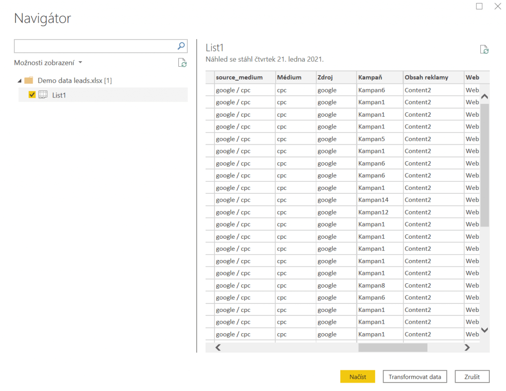 Pokud bychom chtěli, mohli bychom přes tlačítko „Transformovat data“ rovnou provádět úpravy na dané tabulce. Umožnilo by nám to například přejmenovat sloupce, odebrat sloupce, nahradit hodnoty a další úpravy ještě před samotným nahráním do Power BI. Nám v tuto chvíli postačí tlačítko „Načíst“. Jak transformovat data si ukážeme v některém z dalších článků této minisérie.