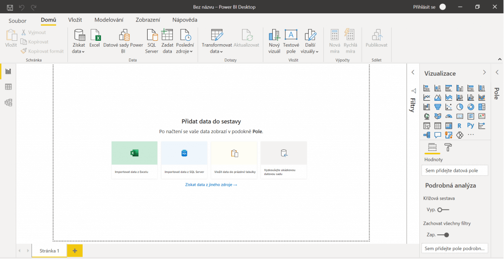 Power BI Desktop slouží pro vytváření a editace dashboardů. Po spuštění Power BI Desktop aplikace se vytvoří nový projekt a uvidíte prázdnou stránku s panely nahoře a po stranách (jako na obrázku výše). Všechna důležitá tlačítka, sloupce a možnosti Power BI Desktop budeme procházet postupně v naší minisérii. Pojďme začít tím, že si nahrajeme nějaká data.
