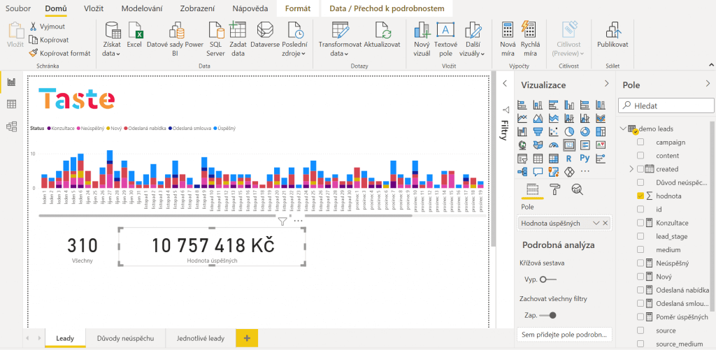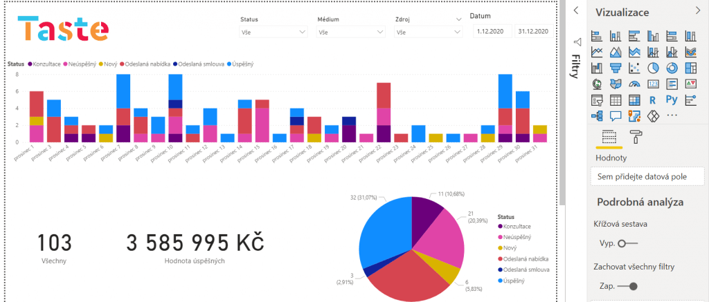 Totožným způsobem přidám i filtr/průřez pro Status, Zdroj a Médium. U jednotlivých filtrů můžete také zobáčkem vpravo nahoře nastavit, zda si přejete mít možnosti filtrace zobrazené jako seznam, či „rozevírací“. Častokrát u filtrů chceme omezit možnosti výběru (například jen na jednu položku v jeden moment). Toto nastavení najdete pod názvem „Jeden výběr“ v nastavení formátu vizuálu. Na obrázku níže můžete vidět výsledek.