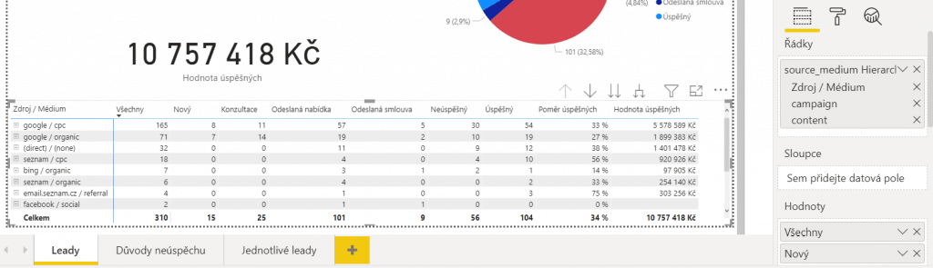 Téměř vždy doporučuji používat Matice, neboť na rozdíl od vizuálu Tabulka umožňují práci s hierarchiemi. O hierarchiích jsme si říkali v minulém článku, avšak téma vytváření hierarchií nás teprve čeká v následujících dílech. Jako řádky zvolíme ty sloupce, podle kterých chceme danou tabulku „řezat“. V názvosloví Google Analytics se bavíme o dimenzích. Oproti tomu do pole hodnot vložíme (v GA názvosloví) metriky. V mém konkrétním případě si přeji zobrazovat data o počtu leadů v jednotlivých fázích a tato data chci „řezat“ dimenzí „Zdroj / Médium“ (viz obrázek níže).