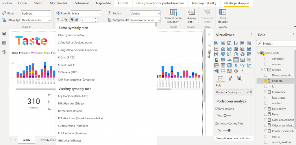 Následně přetáhneme sloupec hodnota do políčka „Pole“ v panelu „Vizualizace“. Dvojklikem také můžeme přepsat název pole třeba na „Hodnota úspěšných“. Zároveň chceme, aby Power BI reflektovalo skutečnost, že hodnoty v tomto sloupci jsou peněžního charakteru. Musíme tedy vybrat formát dat „Měna“ (konkrétně Kč). To uděláme tak, že levým kliknutím myši označíme požadovaný sloupec v panelu „Pole“, což nám nahoře zobrazí lištu „Nástroje sloupců“. Tam pak v rozevíracím seznamu najdeme a vybereme Kč (viz obrázek výše).