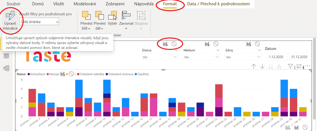 Nejjednodušší bude si to ukázat na příkladu. Dejme tomu, že chceme, aby výsečový graf byl imunní vůči filtracím/klikání v úvodním sloupcovém grafu nahoře. V tomto případě je tedy sloupcový graf iniciační a výsečový graf je reaktivní. Pro tuto změnu chování kliknutím označíme sloupcový graf, čímž se nám na horní liště objeví dvě nové možnosti s názvy “Formát” a “Data/Přechod k podrobnostem”. Vybereme Formát a následně zvolíme úplně vlevo “Upravit interakce” (viz obrázek výše).