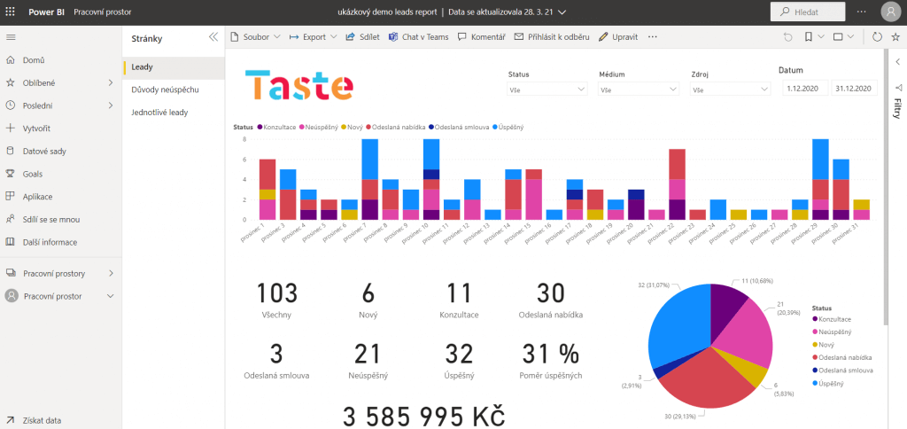 Jakmile nám Power BI Desktop zobrazí hlášku o úspěšné publikaci, můžeme se již přemístit do webového prohlížeče. Všechny dashboardy jsou na webových stránkách app.powerbi.com. Než si budeme moct náš dashboard zobrazit, bude nutné se samozřejmě přihlásit přes náš Power BI účet. Jakmile dojde k přihlášení, budeme mít k dispozici všechny naše sestavy. Po rozkliknutí jedné z nich bude Power BI Service vypadat nějak takto:
