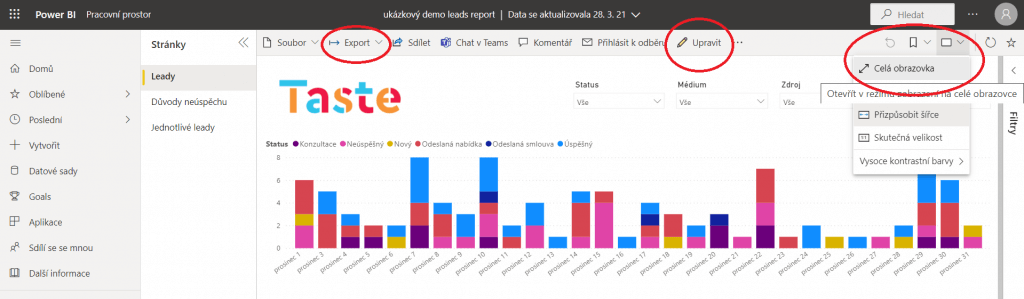 Ve stejné liště najdeme i velmi užitečné tlačítko Exportovat, které nám umožňuje stáhnout si dashboard ve formátu PDF či z něj rovnou vytvořit Power Point prezentaci. Všechna tato důležitá tlačítka jsou označena na obrázku výše. Stejně tak se velice často může hodit možnost zobrazit dashboard přes celou obrazovku – například pro účely prezentace. I toto tlačítko je označeno na obrázku výše (úplně vpravo).