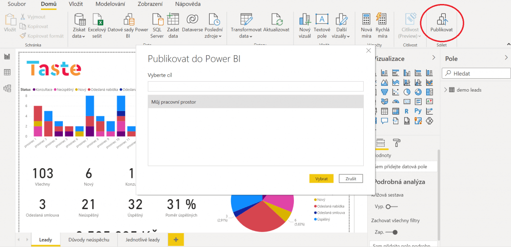 Publikace probíhá z Power BI Desktop do Power BI Service a slouží k přenesení naší sestavy z lokálního PC (kde si ho nikdo zvenčí nemůže prohlédnout) na internet (kde se na dashboard může podívat kdokoliv, s kým daný dashboard sdílíme). Před samotnou publikací je potřeba udělat dvě věci:
