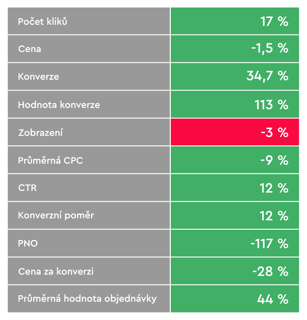 Celková cena se lišila pouze minimálně. Průměrná cena za proklik byla však v rámci maximalizace konverzí nižší o 9 %. Strategie tak zajistila větší počet prokliků, ale také vyšší konverzní poměr téměř o 12 %, což vedlo k většímu množství konverzí a s tím spojené hodnoty konverzí.