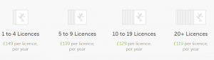 Screaming Frog nabízí značné omezenou FREE verzi a poté klasickou placenou verzi v závislosti na počtu licencí. Roční platba vyjde v CZK kolem 4 500 za 1 licenci pro jednoho uživatele. S každou další licencí od určitého počtu se navíc celková roční platba snižuje viz obrázek dole.