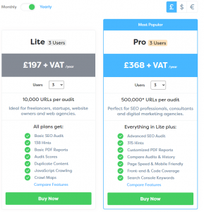Co se týče cen u Sitebulbu, licenci lze platit buď měsíčně nebo ročně a vybrat si lze ze dvou verzí; Lite a Pro. Verze Lite nabízí omezené množství funkcí a vyjde od 3 000 do 3 500 CZK za jednu licenci, podle toho, jaký typ platby (měsíční/roční) zvolíte. Výhodněji vychází ta roční.