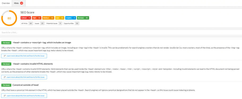 Sitebulb navíc umí zobrazit úspěšně splněné body v rámci auditu webu. To znamená, že lze případně např. v technickém SEO auditu zmínit také pozitiva, nejen negativní nálezy.