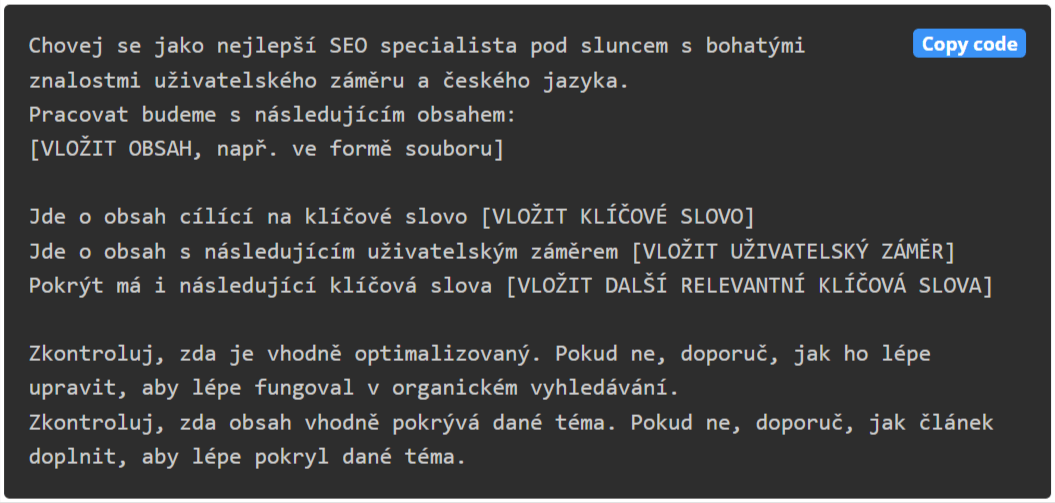 S kontrolou obsahu, zda vhodně pokrývá dané téma a zahrnuje ta správná klíčová slova, může dnes pomoci umělá inteligence, jako je ChatGPT. K tomu může posloužit např. následující prompt: