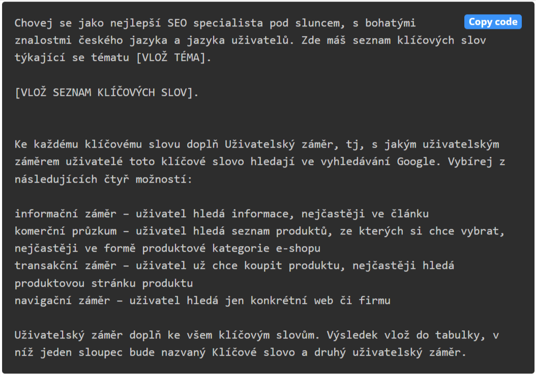Analýza SERPu (výsledků vyhledávání) pro vícero klíčových slov může být zdlouhavá. Existují ale i jiné možnosti, jak zjistit uživatelský záměr. Dnes už ho umějí rozpoznat různé nástroje (např. Ahrefs), případně je možné jej odhadnout pomocí ChatGPT. K tomu poslouží např. následující prompt: